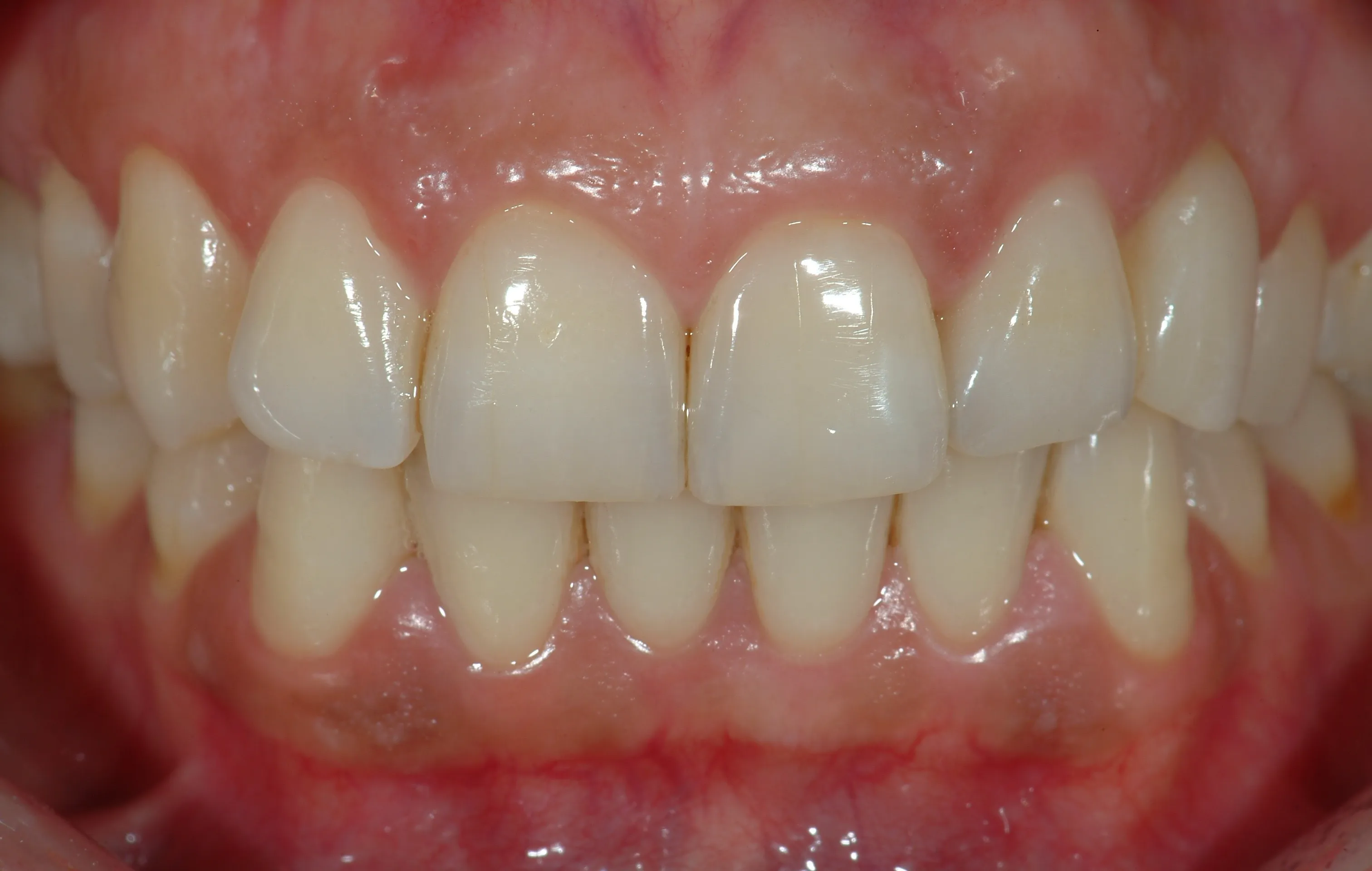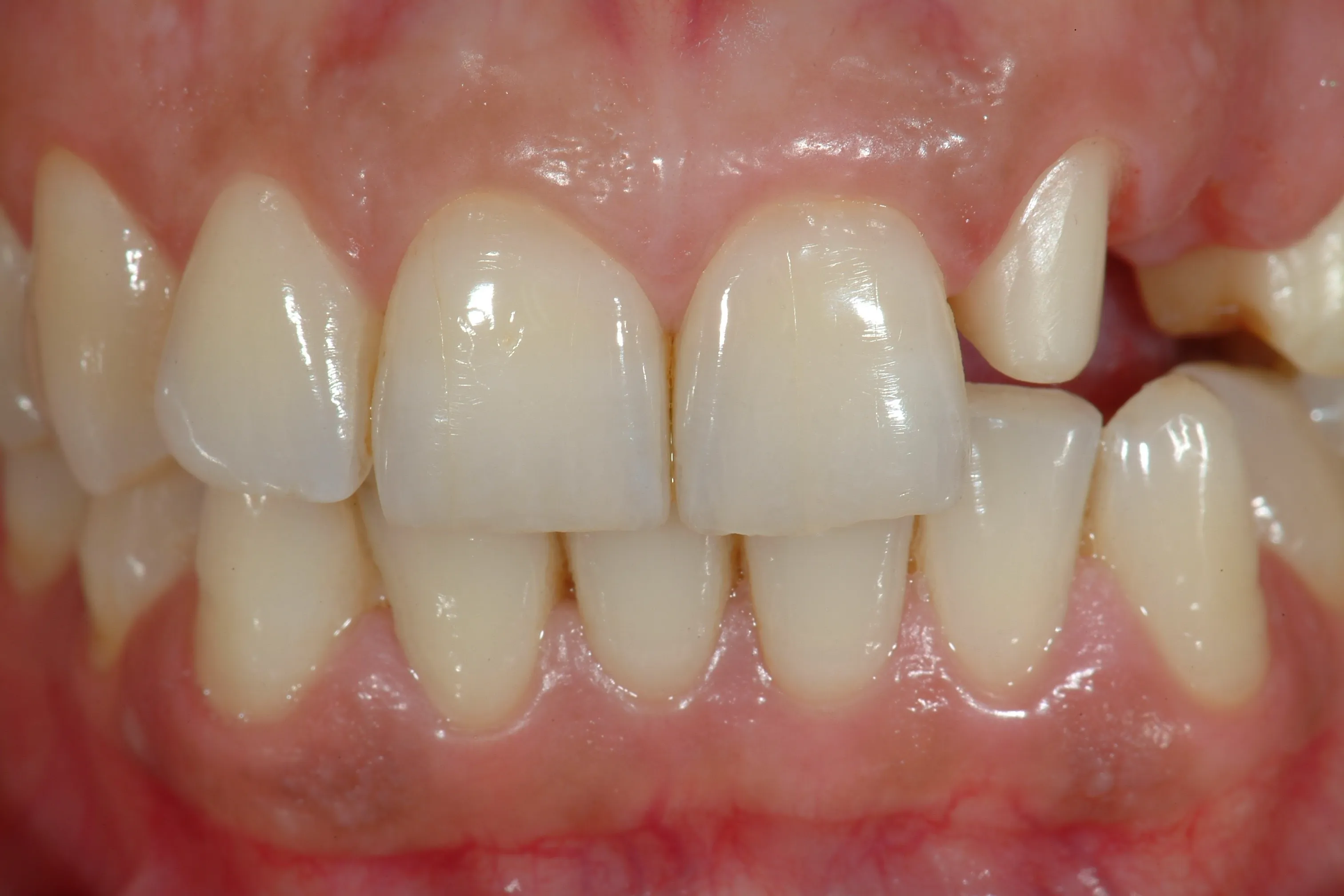 Ripristino completo della funzionalità masticatoria e dell'estetica del sorriso con ponte in Disilicato di Litio, materiale che garantisce estetica e resistenza.